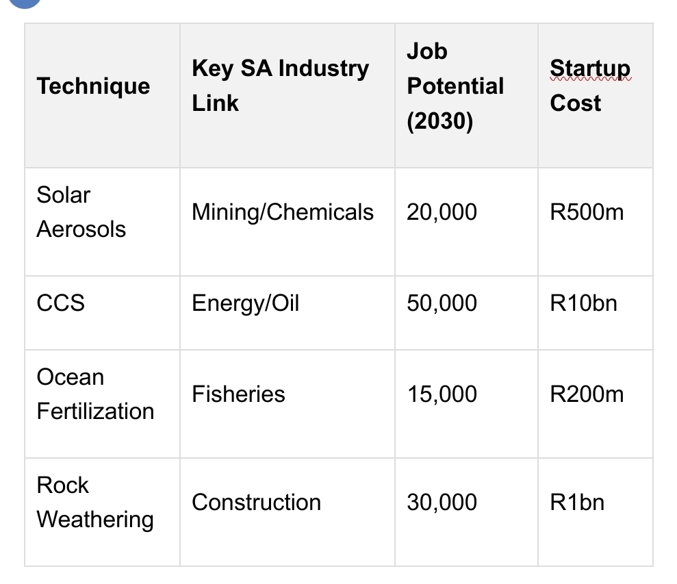 Reflect sunlight to cool Earth 1-2°C—think stratospheric aerosols or cloud brightening.SA edge: Adapt mining tech for calcium carbonate sprays; Richards Bay’s mineral plants pivot easily.